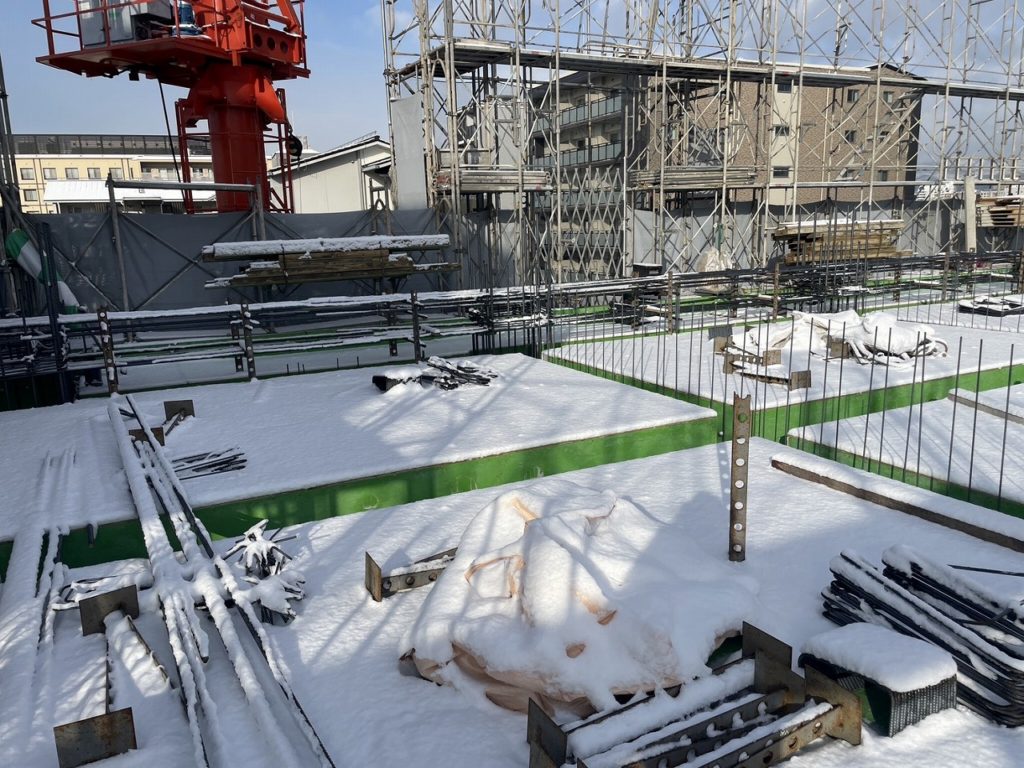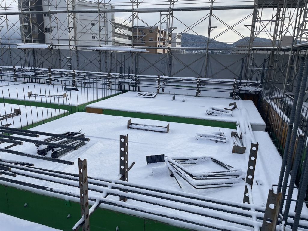 現場もスラブ上に雪だまり!