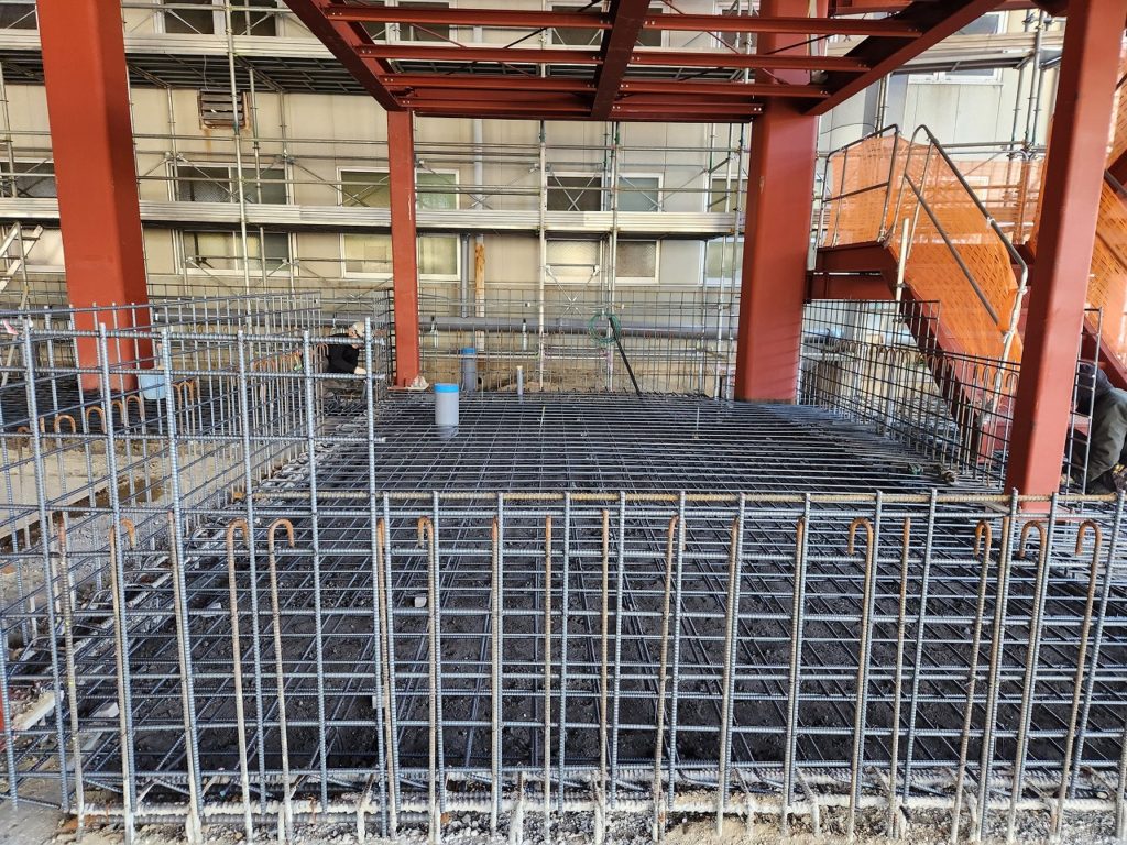 大阪枚方の現場 鉄骨も建て方終わりいよいよ 土間と各階スラブの配筋になります。
